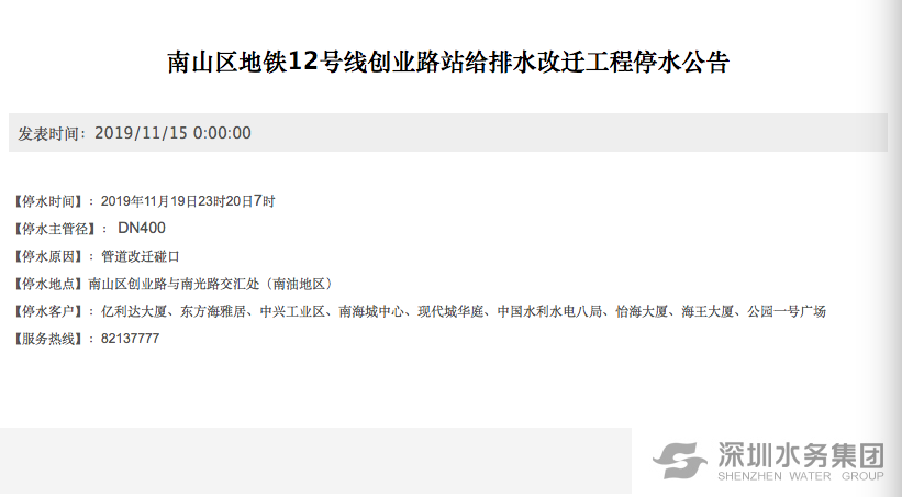 为配合南山区地铁12号线创业路站给排水改迁工程,深圳水务集团计划于11月19日23时20日7时,对南山区创业路与南光路交汇处DN400供水管道进行改迁碰口,届时南油地区暂停供水。具体影响用户为:亿利达大厦、东方海雅居、中兴工业区、南海城中心、现代城华庭、中国水利水电八局、怡海大厦、海王大厦、公园一号广场。
