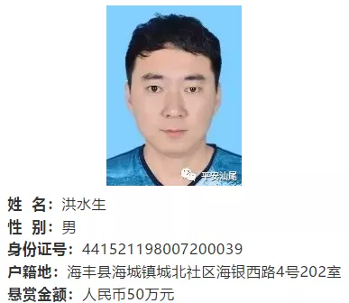汕尾市公安局于11月11日发布的通告中,共有3人被悬赏通缉,分别是郑海田(金额100万)、唐伟杰(金额100万)、洪水生(金额50万)。
