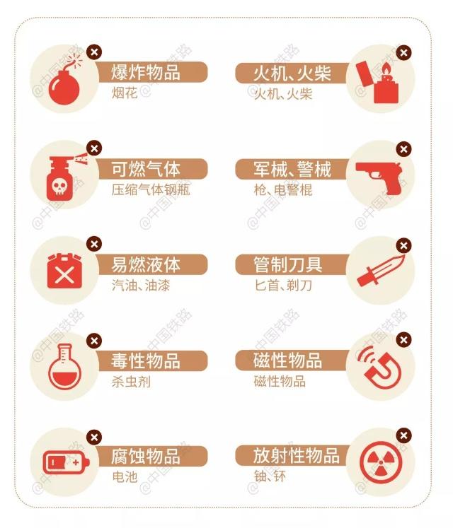 根据铁路部门相关规定,枪支弹药、管制刀具、易燃易爆物品、腐蚀性物品、剧毒物品以及其他危险品不能带进站乘车。