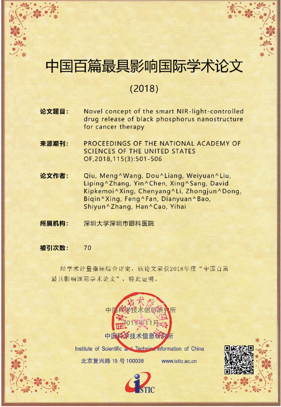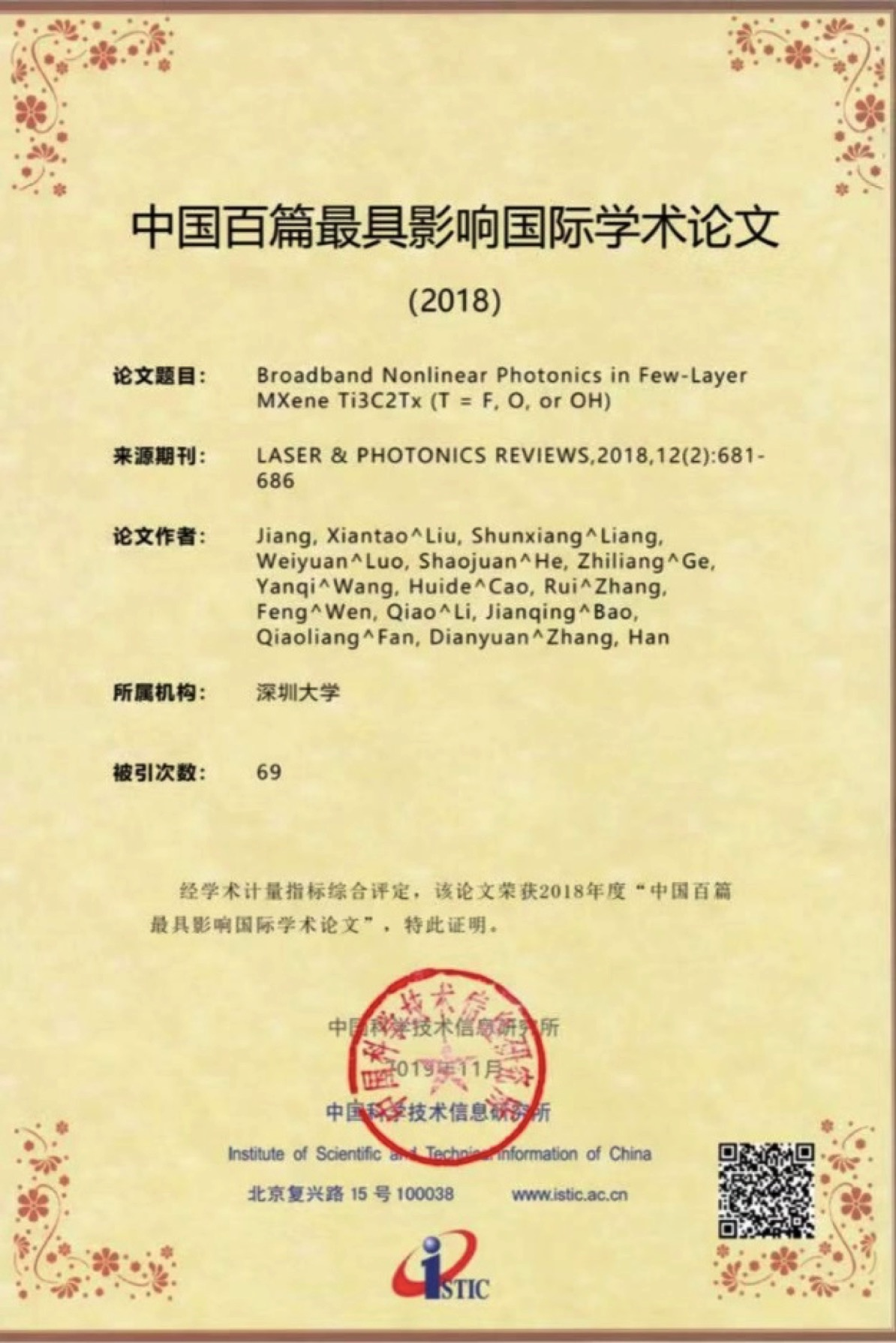 原标题:2018年中国百篇最具影响国际学术论文公布,深大张晗课题组2篇论文入选