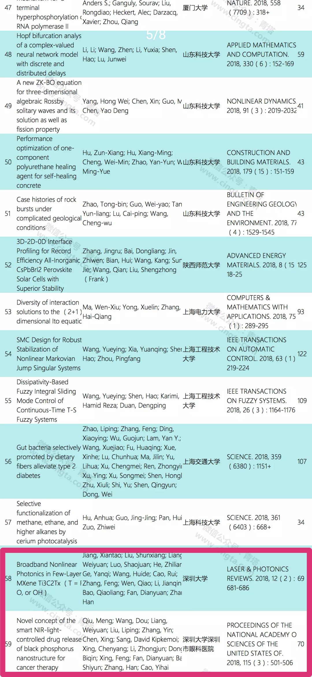 张晗教授课题组入选的2篇论文分别为《Broadband Nonlinear Photonics in Few-Layer MXene Ti3C2Tx (T = F, O, or OH)(新型智能近红外光控黑磷纳米结构释药系统用于癌症治疗)》,所属机构为深圳大学,来源期刊为《LASER & PHOTONICS REVIEWS.2018,12(2):681-686(美国科学院院刊)》,被引次数69;《Novel concept of the smart NIR-light-controlled drug release of black phosphorus nanostructure for cancer therapy(少层MXene纳米片中的非线性光子学)》,所属机构为深圳大学深圳市眼科医院,来源期刊为《PROCEEDINGS OF THE NATIONAL ACADEMY OF SCIENCES OF THE UNITED STATES OF.2018,115(3):501-506(激光光子学评论)》,被引次数70。