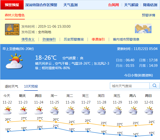 见圳客户端·深圳新闻网2019年11月22日讯 深圳市气象局预计22日晴天干燥,早晚清凉,气温18-26℃;23-24日多云间晴天,部分时间有轻雾或霾;25日夜间至26日冷空气影响,北风加大,气温略降;展望27日夜间冷空气继续补充,气温持续下降。