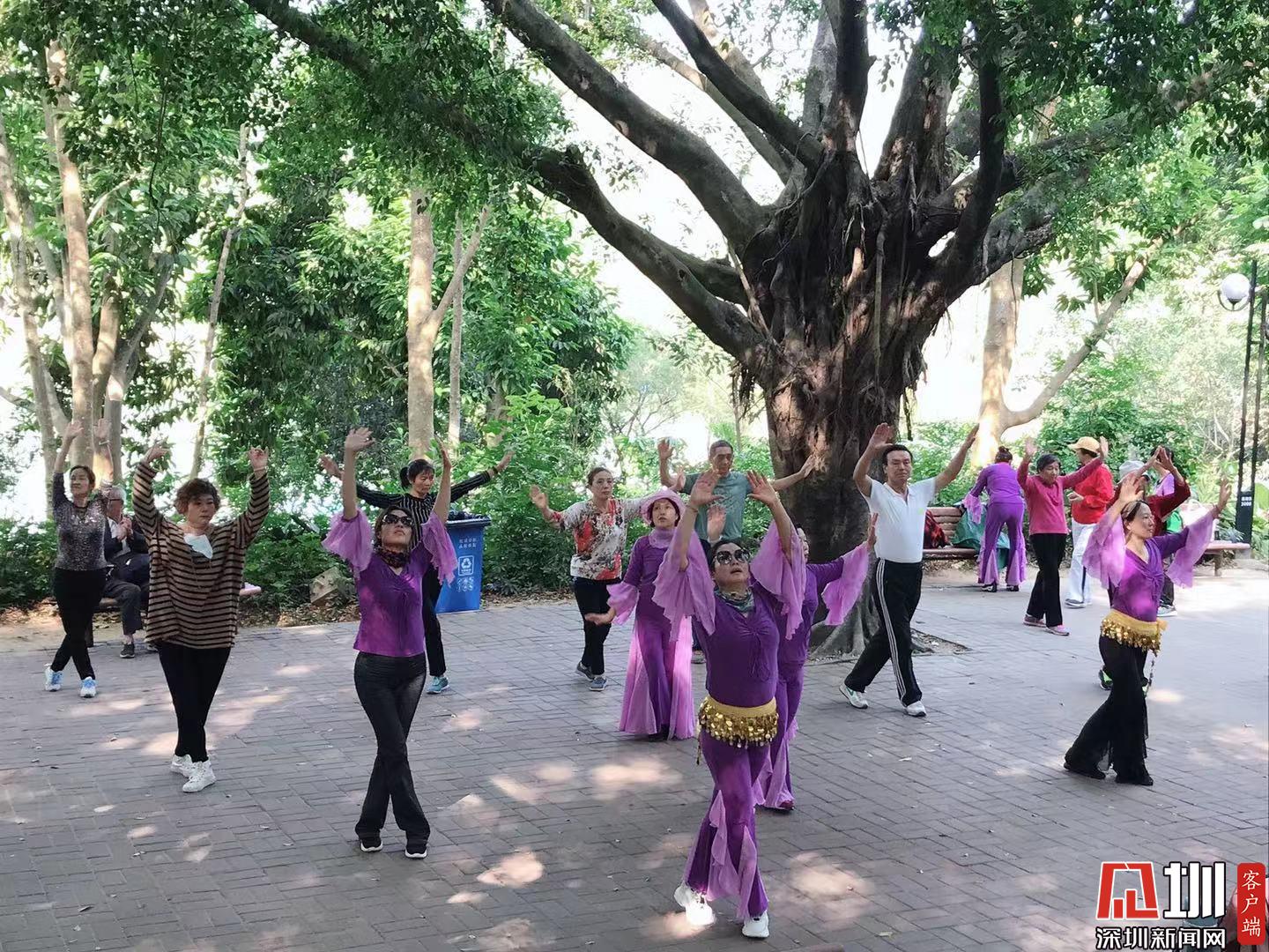 市民在莲花山集体晨练,秩序井然,文明运动。