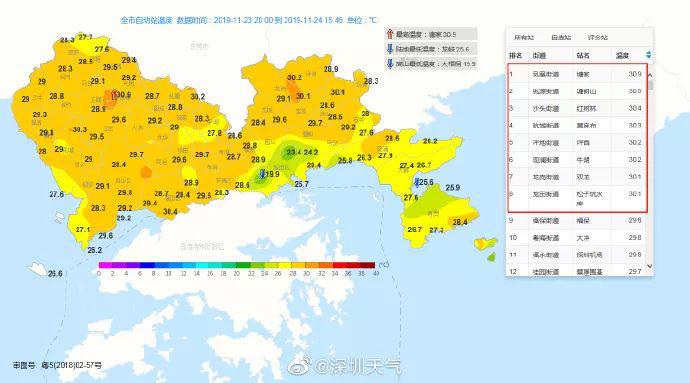 11月24日,深圳大部分地区最高气温在28-29 ℃,有8个站点破了"3"字头(这熟悉的黄色图……)