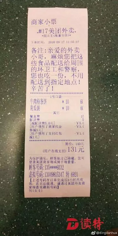 11点35分,面点王又收到了一张订单。牛肉粉条饼和南瓜粥各10份,共计131元。员工发现,这张订单上的备注和名称与此前的一模一样,皆是让外卖小哥送给周围的环卫工和警察。随后,面点王其他分店也收到了类似的订单。据面点王员工统计,何老师总计点了1300多元外卖。随后,这些食物被分成180份送出。