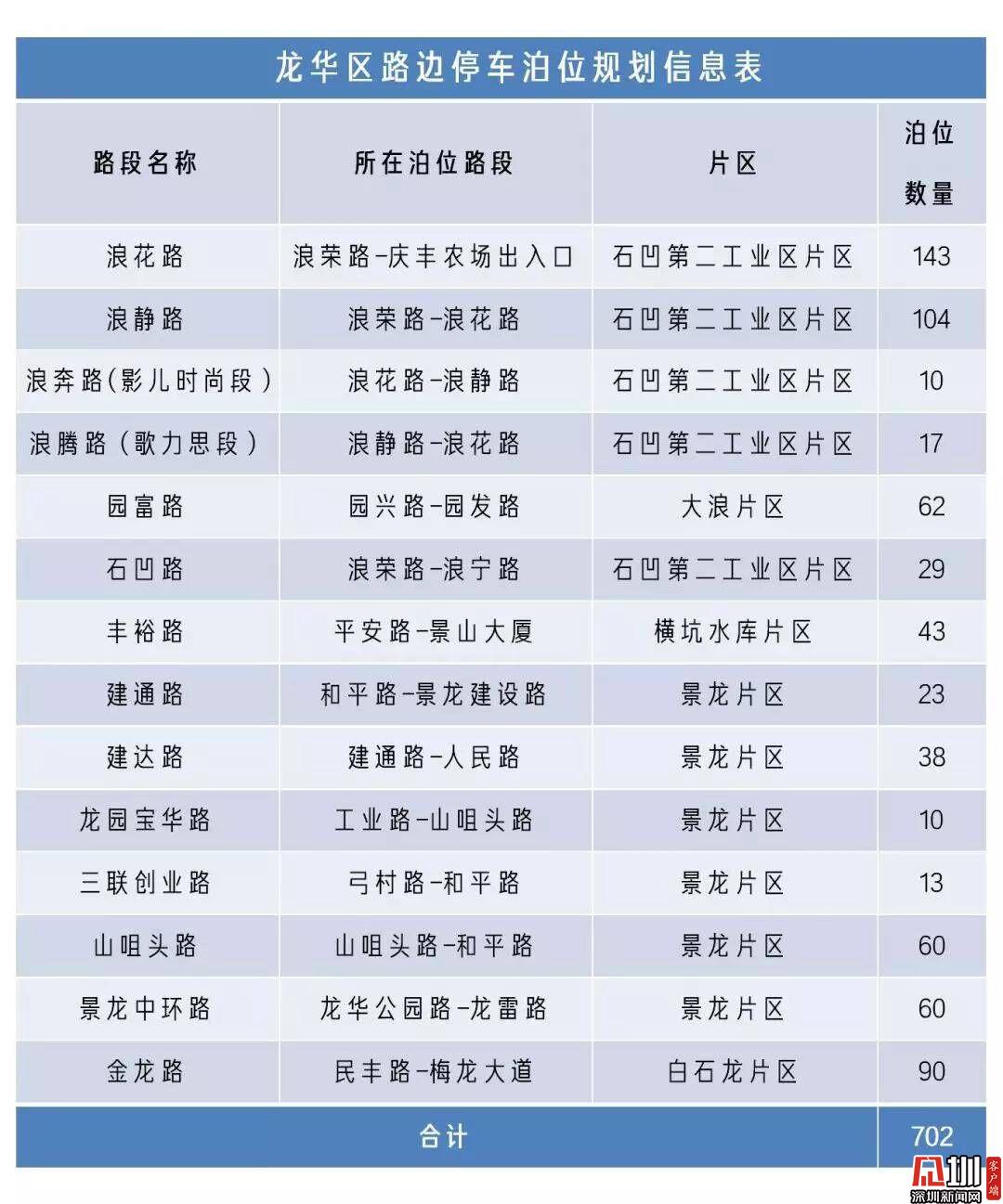 龙华区路边宜停车位规划信息表。