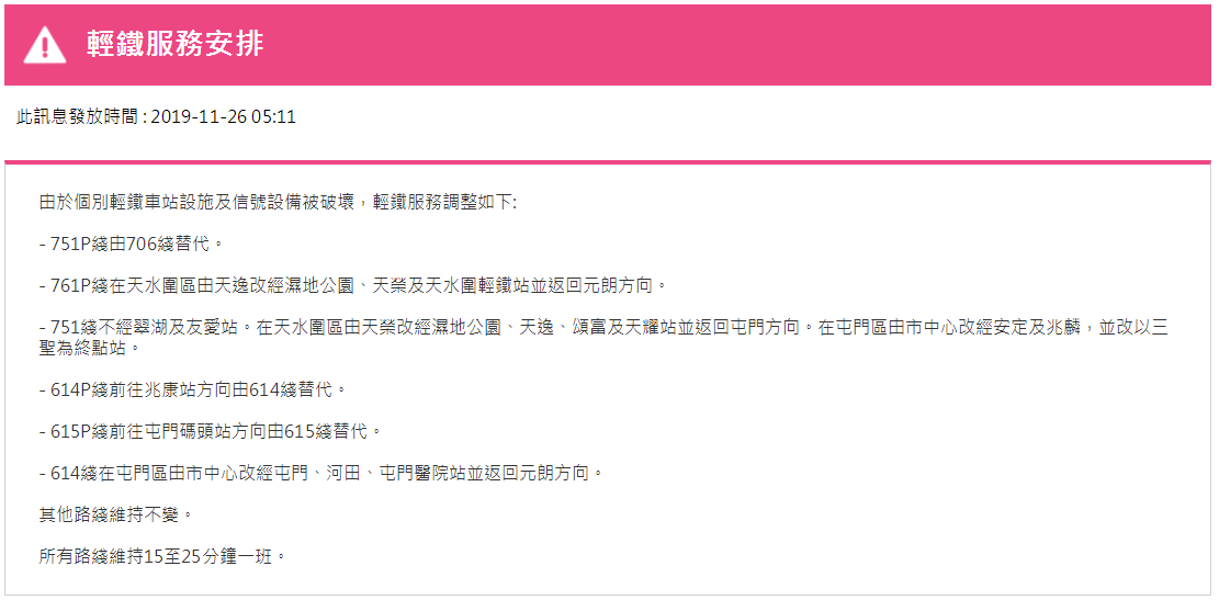 据港铁消息,11月26日,香港地铁各线(机场快线除外)、轻铁及港铁巴士的服务将于晚上11:30时结束。大学站继续关闭,列车不停大学站。个别车站出入口也会暂时关闭。