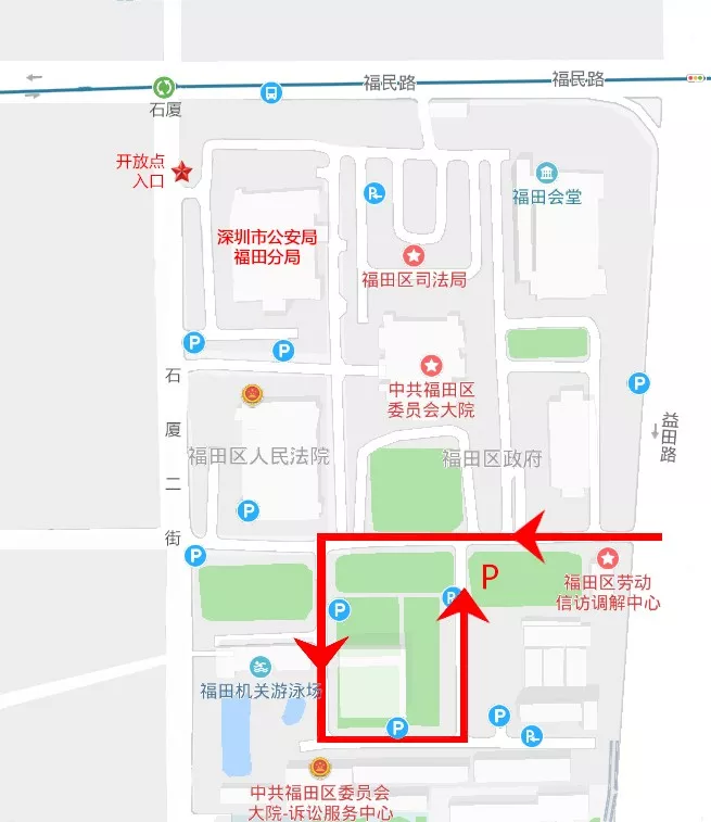 可乘坐公交线路:34路、73路、202路、303路、b689路、b957路、m133路、m389路、m390路至福田区委站下车