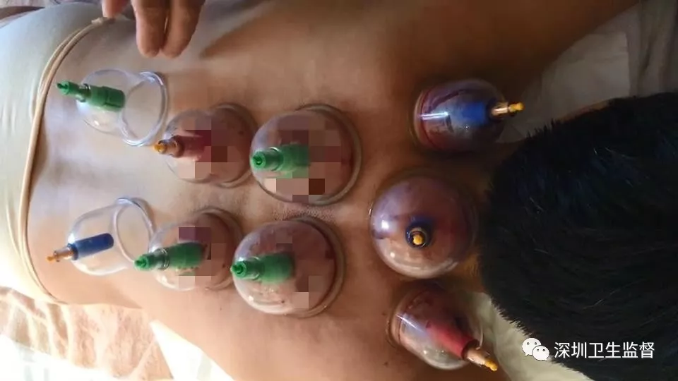 接受按摩治疗的女子背后,吸了7个罐子,可与其它普通拔罐不同的是,每个罐子里,竟然都有血珠不断溢出……