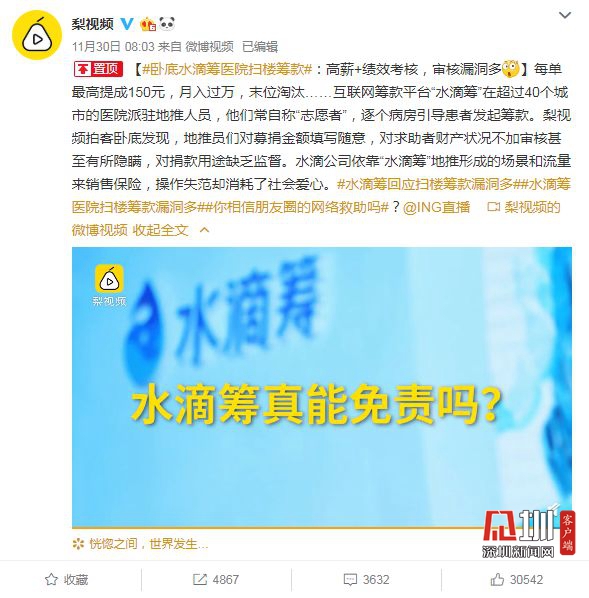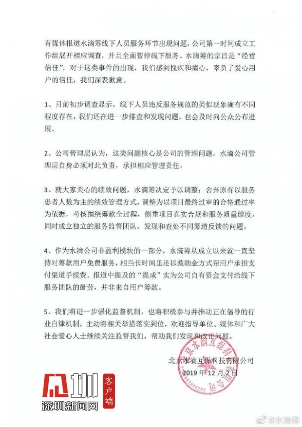 见圳客户端.深圳新闻网2019年12月6日讯(见圳客户端、深圳新闻网记者 张玲)2019年11月30日,据梨视频报道,互联网筹款平台“水滴筹”在超过40个城市的医院派驻地推人员,线下地推服务人员被指在医院“扫楼”寻找求助者,套用模板,随意填写金额,不审核甚至隐瞒求助者财产状况,鼓励患者大量转发筹款信息。同日,水滴筹通过微博官方认证公众号回应称,已第一时间成立紧急工作小组开展相关情况排查,同时线下服务团队全面暂停服务,整顿彻查类似违规行为,并对梨视频报道可能引发的误解进行了3点说明。