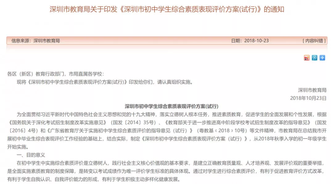 ▲深圳市教育局此前发布的《深圳市初中学生综合素质表现评价方案(试行)》