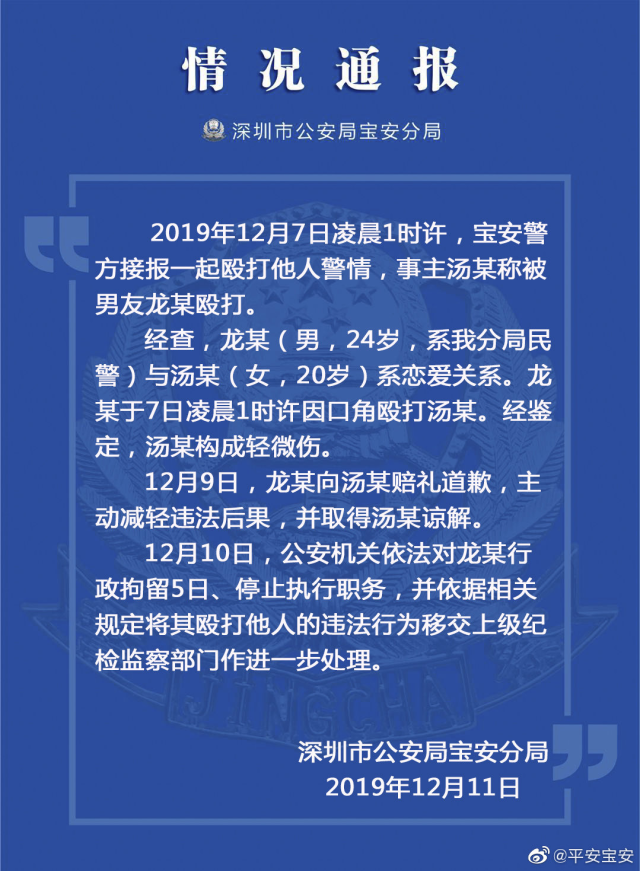 见圳客户端·深圳新闻网2019年12月12日讯 近日,有媒体报道了深圳女子被男友从家打到楼道,引发社会广泛关注。12月11日,深圳市公安局宝安分局发布通报称,家暴施暴男子系宝安分局民警,公安机关依法对其行拘5日,停止执行职务。