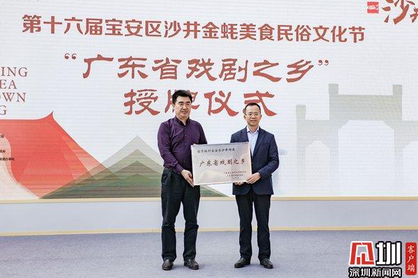 开幕式还举行了“广东省戏剧之乡”授牌仪式。广东省文联、广东省戏剧家协会授予沙井街道“广东省戏剧之乡”。广东省戏剧家协会专职副主席林金洲授牌。到今天为止,“广东省戏剧之乡”全广东省只有四个,沙井今天也成为深圳市第一个“广东省戏剧之乡”。
