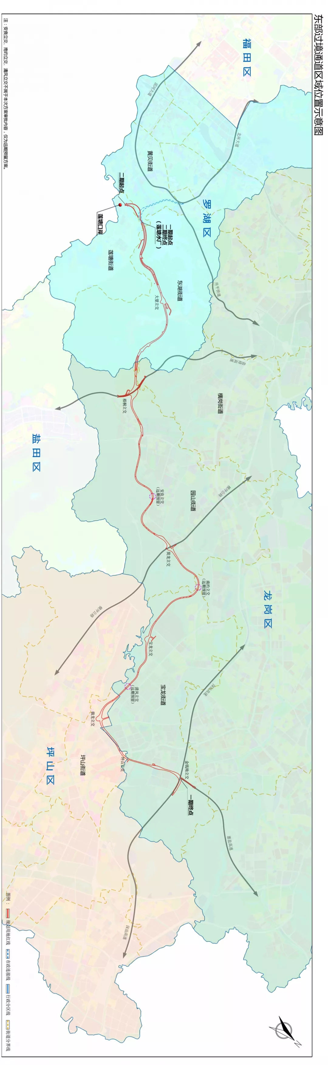 深圳市东部过境通道拟选址于罗湖区莲塘街道、黄贝街道和东湖街道,龙岗区横岗街道、园山街道和宝龙街道,坪山区坪山街道区域内。