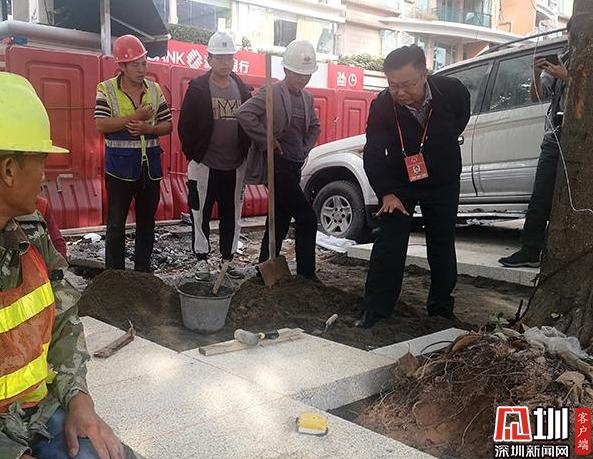 深圳市人大代表胡桂梁(右一)在施工现场进行调研。