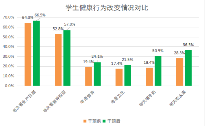 通过1学年的营养教育活动,评估发现,学生选择经常吃的零食中,水果类排名第一,占69.6%;糖果类由26.6%明显下降至19.9%,降幅25%。经常喝的饮料依次是白开水、纯牛奶酸奶、果汁和碳酸饮料,干预后白开水和牛奶比例分别提升至83.4%和76.7%,升幅均超过10%;果汁和碳酸饮料分别降低至38.9%和17.3%,尤其是碳酸饮料降幅超过了30%。每天喝牛奶的比例明显提升至30.5%,升幅65.8%;每天吃水果的比例提升至36.5%,升幅达到36.5%。每天吃早餐的比例由67.8%上升至74%。