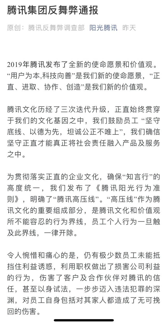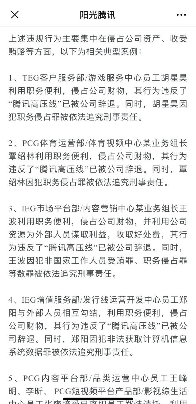 3、IEG市场平台部/内容营销中心某业务组长王波利用职务便利,侵占公司财物,并利用公司资源为外部人员谋取利益,收取好处费,其行为违反了“腾讯高压线”已被公司辞退。同时,王波因犯非国家工作人员受贿罪、职务侵占罪等数罪被依法追究刑事责任。