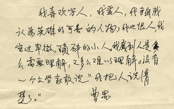 确实,我们从曹禺四部经典作品中,无不能感受到他对人物内心的关注,他总是以“一种悲悯的心情来写剧中人物的争执”。他曾说:“我喜欢写人,我爱写人,我写出我认为英雄的可喜的人,我也恨人,我写过卑微、琐碎的小人。我感到人是多么需要理解,又多么难以理解。”直至晚年,他仍喜欢观察人。采访中,曹禺女儿万方回忆道:“早已生病住院的父亲,即使没有力气走路,只能坐轮椅了,他也很愿意送我到医院门口。为什么呢?因为这样他可以在门口,坐在轮椅上看看街边来来往往的行人。”或许,这便是曹禺剧作经久不衰的原因。