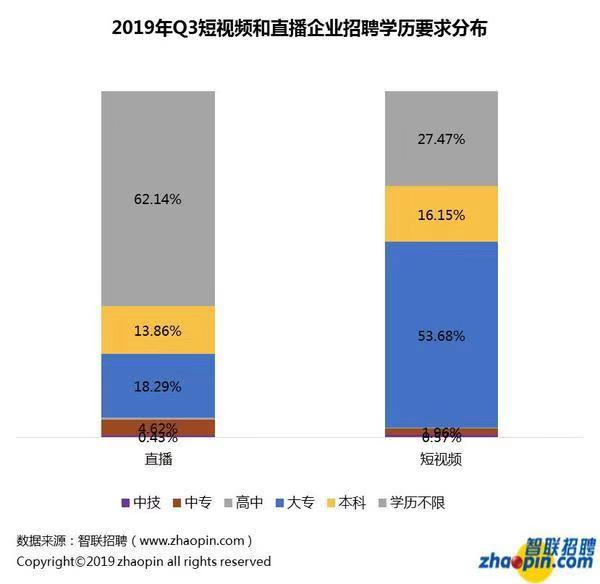 短视频相关岗位对内容创意、视频编辑等知识和技能的要求更高,因此对人才素质要求也更高。2019年三季度,短视频招聘职位中,53.68%的职位要求大专学历,16.15%的职位要求本科学历,直播领域的这两个比例分别为18.29%和13.86%,却有62.14%的岗位不限学历。