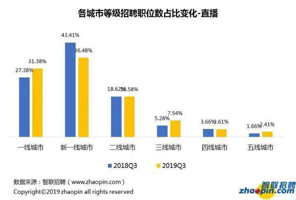 从趋势上看,短视频机构随着用户的下沉也在下沉,而直播领域呈现进一步向一线城市聚集的趋势。2019年三季度,短视频行业在一线城市的招聘需求占比较去年同期下降了7.21个百分点,新一线、二线、三线等比例均有提高;直播行业在一线城市的招聘需求占比则是提高了4个百分点。(记者 庄瑞玉)
