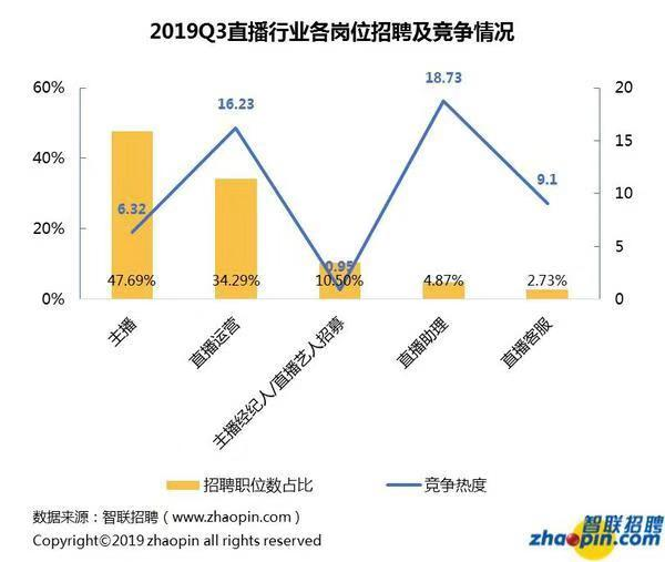 由于主播的IP号召力直接左右直播流量,其流量变现能力也是企业与平台合作的首要考量。因此对直播平台、MCN机构等运营机构而言,"能带货"的主播多多益善,2019年三季度主播的招聘岗位数占整个直播行业的47.69%,接近一半。与此同时,直播行业发展至今,已无力再吃老本儿,而是需要更多新鲜玩法来打破千篇一律的模式。精细化运营的趋势成为必然,2019年三季度,有34.29%的岗位面向直播运营人才。而从人才端看,在招聘平台上求职的直播运营和直播助理类人才较多,两个岗位的竞争热度分别为16.23和18.73。