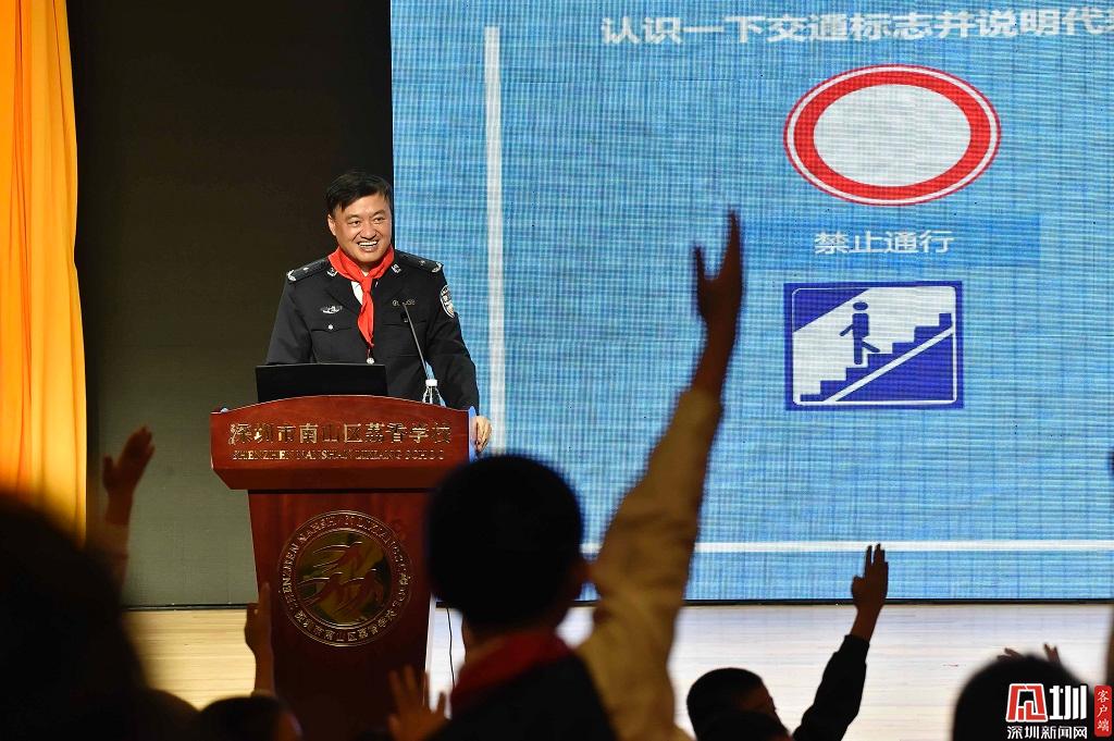 2019年2月20日,南山区荔香学校,市交警局局长徐炜正在向学生们讲述交通安全知识。为加强2019年度新学期校园交通安全宣传工作,深圳交警联合市教育局在新学期开学期间,在全市范围开展“交通安全教育第一课”授课活动。