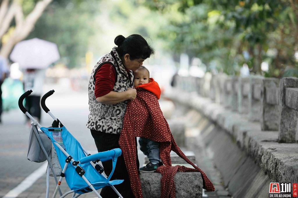 2019年11月19日,深圳福田区,由于气温骤降,一位家长正在为孩子添衣保暖。