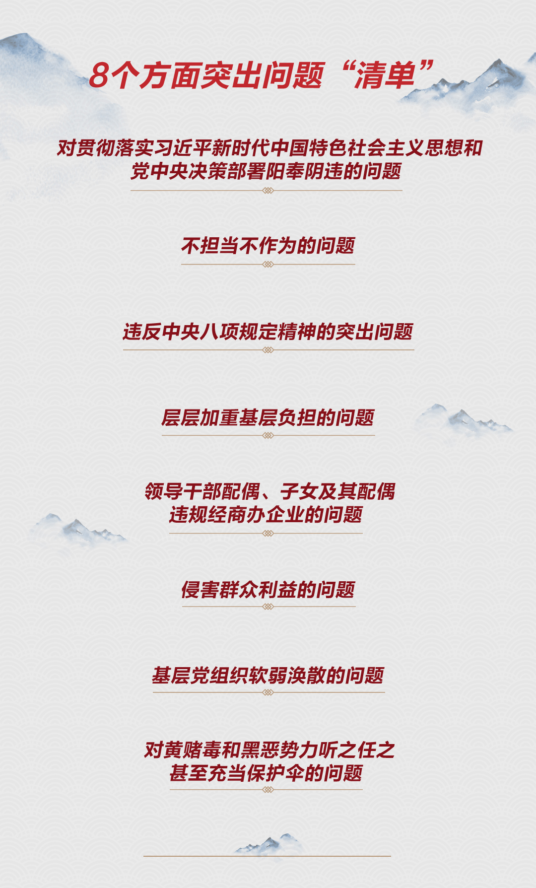 去年7月,一份《关于在“不忘初心、牢记使命”主题教育中开展专项整治的通知》印发全国,列出了8个方面的突出问题。主题教育把开展专项整治作为增强实效的重要抓手,做到问题不解决不松劲、解决不彻底不放手、群众不认可不罢休。12月底,中共中央政治局“不忘初心、牢记使命”专题民主生活会指出,“突出问题专项整治成效明显”。