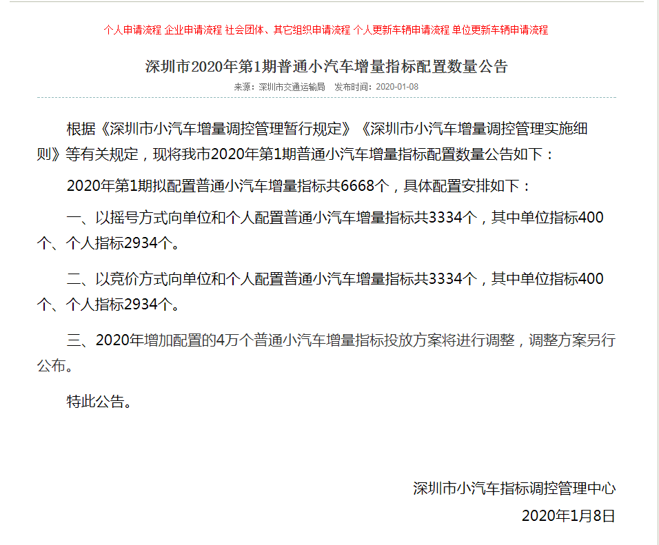 2020年深圳首期小汽车摇号竞价推迟一周,顺延至节后第一个工作日1月31日。