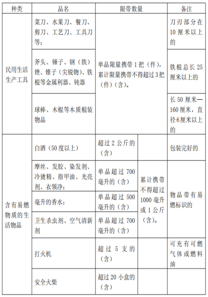 春运禁带、限量物品: