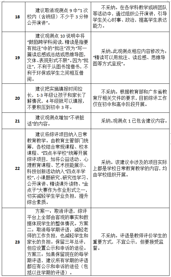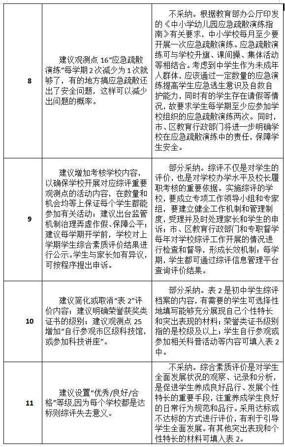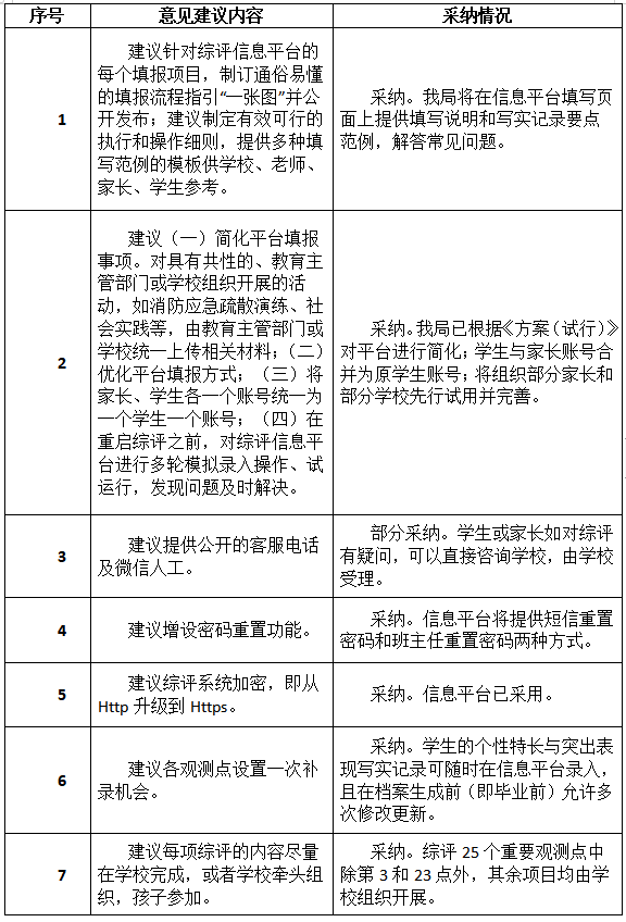 市教育局通报指出,在意见征集期间,该局共收到304个邮件及2个信件。市教育局对上述建议进行了统一的分类,这些建议被分成了34类,并组织了专家学者进行了认真研究。其中,有关平台简化、允许修改更新、建立综评宣导队伍等14类建议被采纳,另有5类建议被部分采纳,余下15类建议没有被采纳。