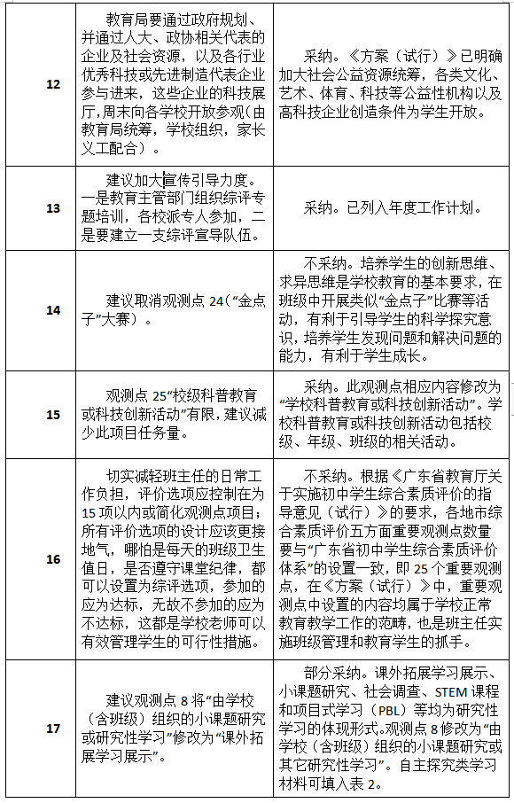 原标题:最新进展!深圳初中综评新方案征集到34类建议,其中19类被采纳或部分采纳
