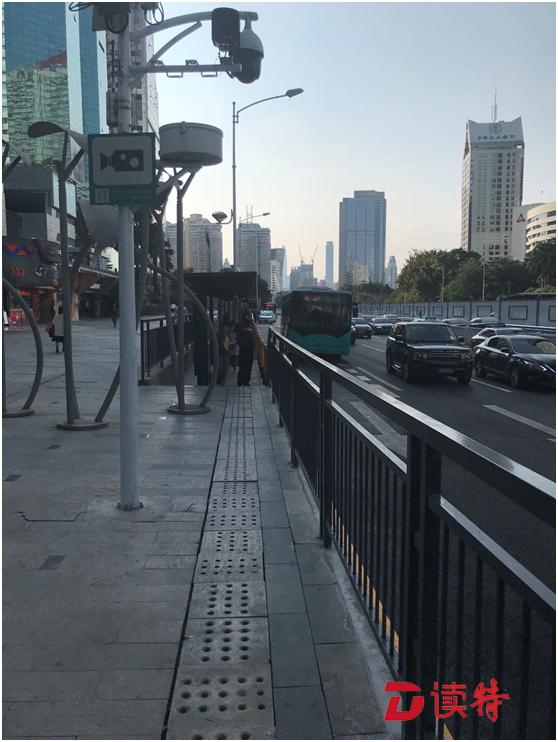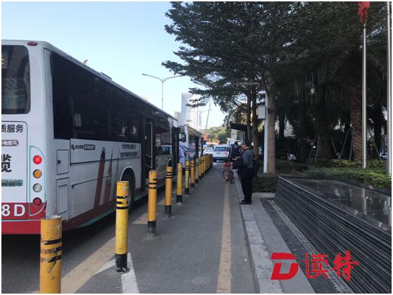 ▲1月14日下午,记者拍摄的深南大道南侧岗厦北地铁站②公交站,被隔离桩隔离处的人行道非常狭窄,给行人、自行车和上下公交车的乘客都带来不便。