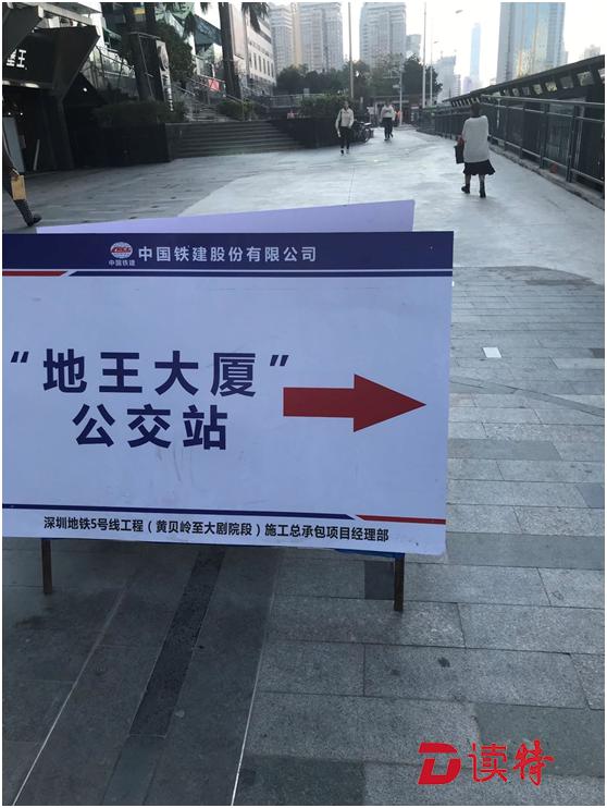 而另一处地点,从大剧院地铁站 F出口处往罗湖书城方向,行人须绕行街边花园步道和街边商家通道,对于骑自行车和电动车的人尤其不便。而地王大厦公交站台跟岗厦北地铁站②公交站台一样非常狭窄,站台左右两边的人行道狭窄处仅约两米宽。在该处站台背后,中国铁建股份有限公司设置了一块站名指示牌,署名单位为地铁5号线施工总承包项目经理部。记者询问了一位路过的市民,市民说经常路过此地,应该是地铁施工所以就占用了之前的人行道,"这里走路还好,骑车就不方便了,因为有台阶"。