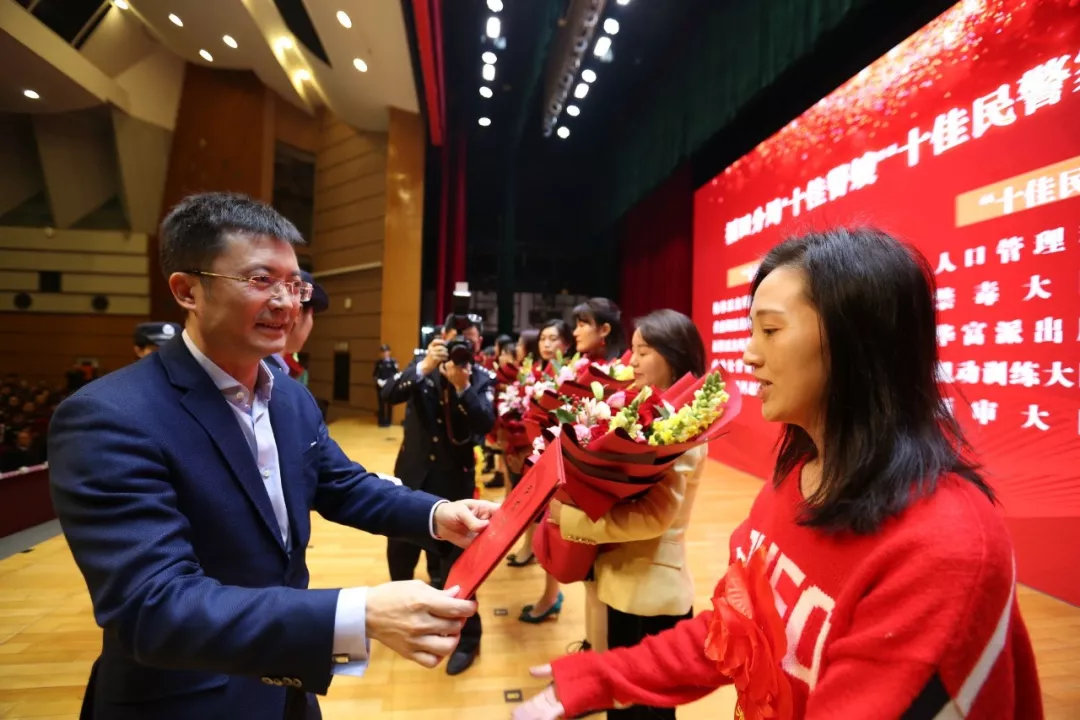 ▲市公安局党委委员、副局长官尔杰,区委副书记黄晓鹏为优秀辅警代表颁奖
