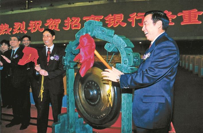 ▲2002年,招行在深交所挂牌上市,马蔚华(右一)在敲钟。