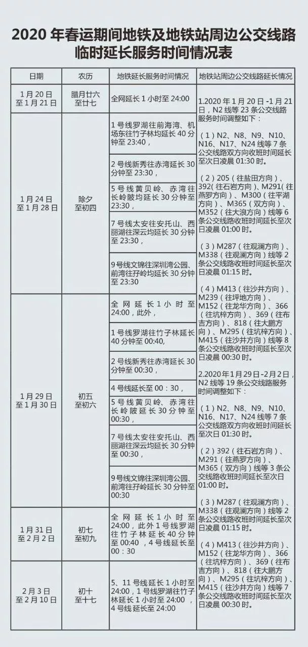 深圳地铁全网及周边公交线延时安排,
