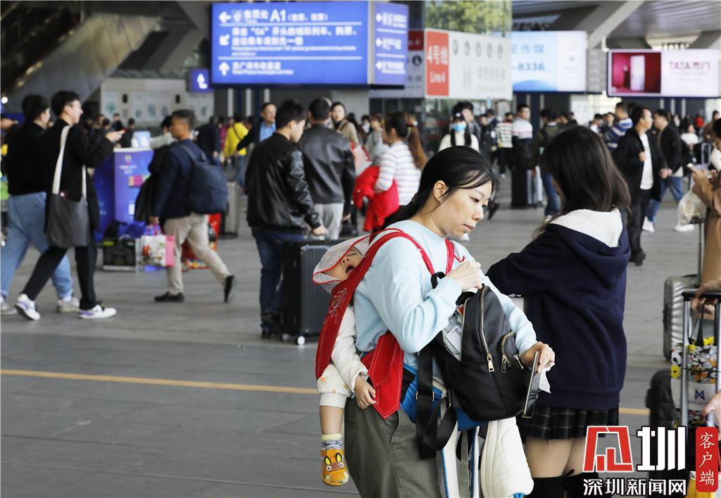深圳北站东广场入站口,一位家长背着一位熟睡的孩子。
