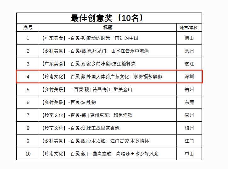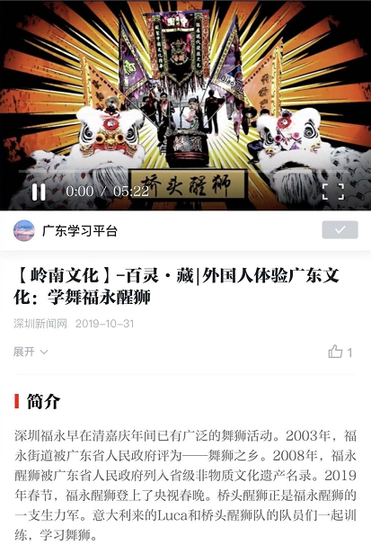 见圳客户端·深圳新闻网2020年1月21日讯 1月20日,由省委宣传部指导、“学习强国”广东学习平台主办的广东乡村微视频大赛获奖结果新鲜出炉。由深圳新闻网拍摄的《外国人体验广东文化:学舞福永醒狮》从9375条参赛视频中脱颖而出,获得大赛一等奖及最佳创意奖。