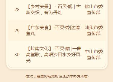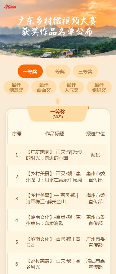 据了解,为庆祝新中国成立70周年,生动展示党的十八大以来,广东高举习近平新时代中国特色社会主义思想伟大旗帜、深入推进美丽乡村建设的丰硕成果,广东乡村微视频大赛于8月20日正式启动。本次微视频大赛历时2个多月,共征集参赛作品9375条,审核展示5996条。广东学习平台PC端和手机APP开设参赛作品展播专题。经过网上展播和网络投票,以及专家评审,评选出一等奖30名,二等奖100名,三等奖1000名,以及最佳创意奖、最佳画面奖、最佳人气奖各10名。佛山、广州、惠州等10个地级以上市党委宣传部获大赛组织奖。
