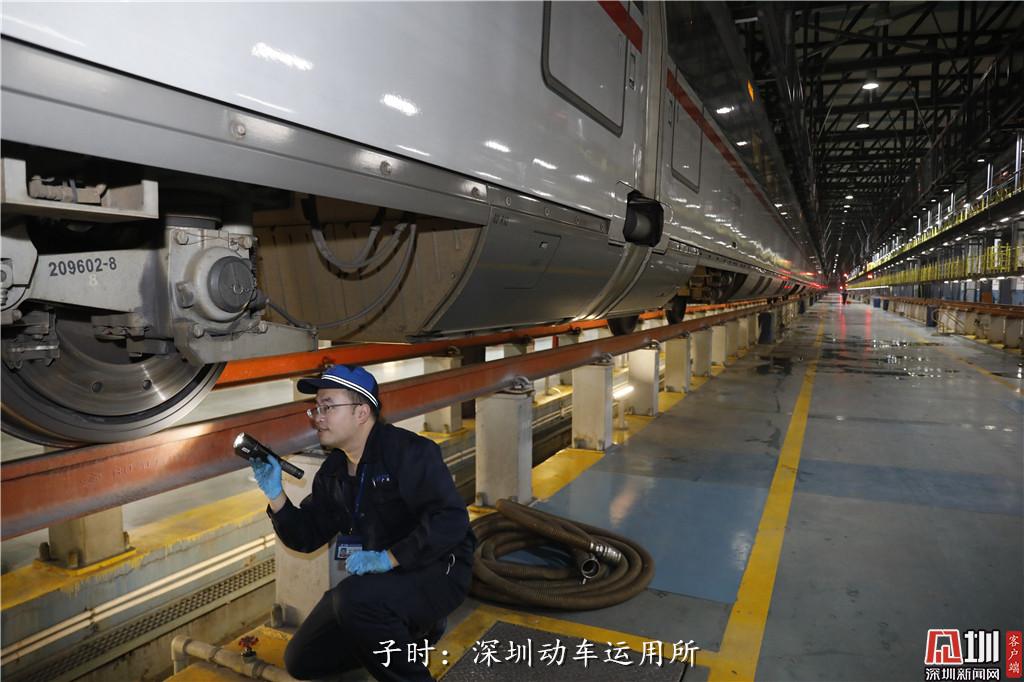 子时:凌晨0点26分,深圳动车运用所检修车间内,动车地勤机械师陈恺正在给“下班”的动车检修。据了解,深圳动车所的员工有600多人,平均年龄只有25岁,每年春节,他们都要在动车所里度过。