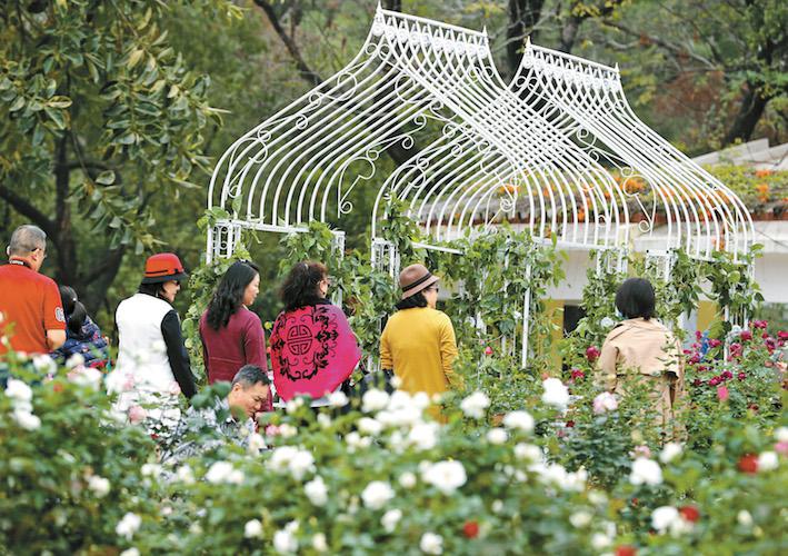 ▲玫瑰之约月季主题花园吸引市民驻足观赏。
