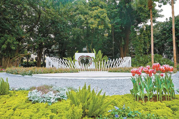 ▲玫瑰之约月季主题花园布置了心形创意花台。