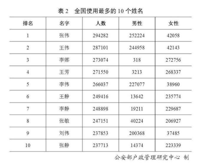全国户籍人口中,有30万个“张伟”、27万个“李娜”…