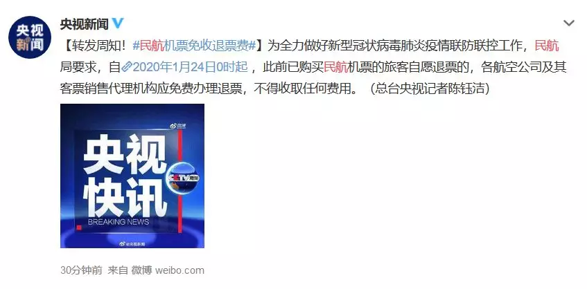 为全力做好新型冠状病毒肺炎疫情联防联控工作,民航局要求,自2020年1月24日0时起,此前已购买民航机票的旅客自愿退票的,各航空公司及其客票销售代理机构应免费办理退票,不得收取任何费用。