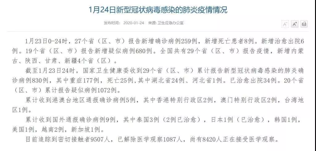 截至1月23日24时,国家卫生健康委收到29个省(区、市)累计报告新型冠状病毒感染的肺炎确诊病例830例,其中重症177例,死亡25例,其中湖北省24例、河北省1例。已治愈出院34例。20个省(区、市)累计报告疑似病例1072例。