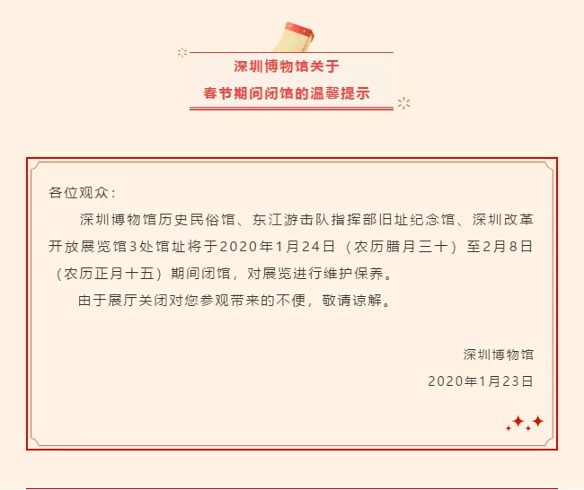 深圳博物馆历史民俗馆、东江游击队指挥部旧址纪念馆、深圳改革开放展览馆3处馆址将于2020年1月24日(农历腊月三十)至2月8日(农历正月十五)期间闭馆,对展览进行维护保养。由于展厅关闭对您参观带来的不便,敬请谅解。
