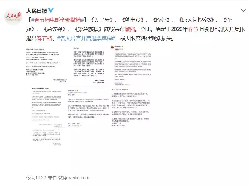 因“担忧疫情进一步扩散”、“考虑影院密闭空间的病源传播风险”等因素,23日,2020春节档的七部影片《唐人街探案3》《囧妈》《夺冠》《紧急救援》《姜子牙》《熊出没·狂野大陆》《急先锋》集体宣布撤档,均将择日再映。各大片方开启退票流程,最大限度降低观众损失。