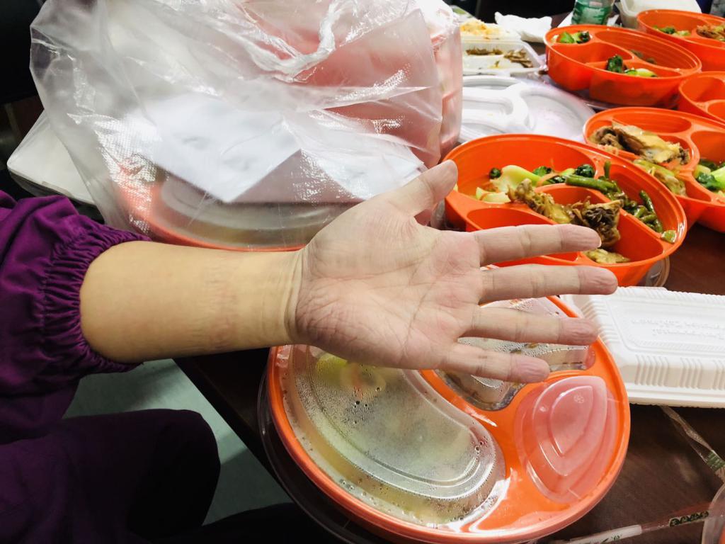 ▲大年三十下午2时左右,深圳市第三人民医院感染 ICU病房的护士刚吃上饭。他穿着防护服、戴着口罩,闷得透不过气来,浑身都是汗。手被泡得起了皱,脸上依然还有口罩压着的痕迹。