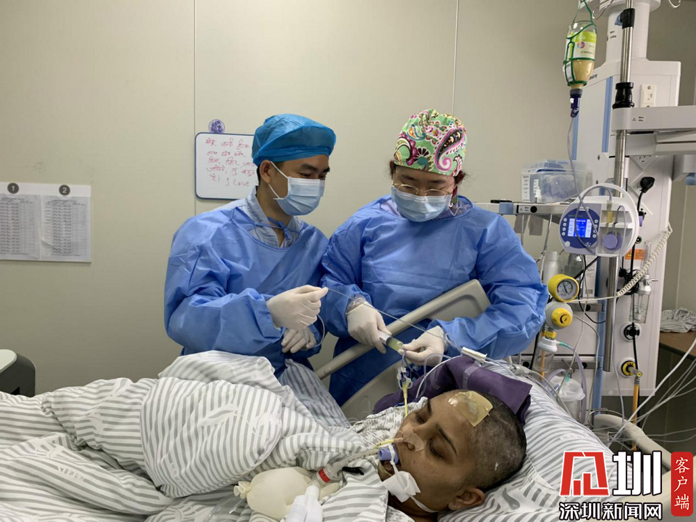 护士秦宝邦和韩天琦正在给印度籍女教师喂药和水。此前,她因化脓性链球菌感染引发了重症肺炎,被转送入医院。在ICU的全力救治下,她的病情已经有了很大的好转。